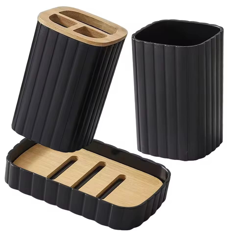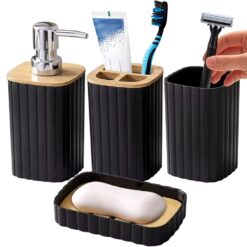 The bathroom set includes 4 items made of durable and lightweight plastic. Thanks to the black color, the set will easily fit into any interior, giving the bathroom a neat look.